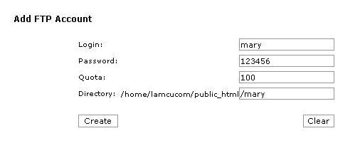 4. 輸入子FTP戶口的名稱( Login )、密碼( Password ) 、容量( Quota ),然後按「Create 」